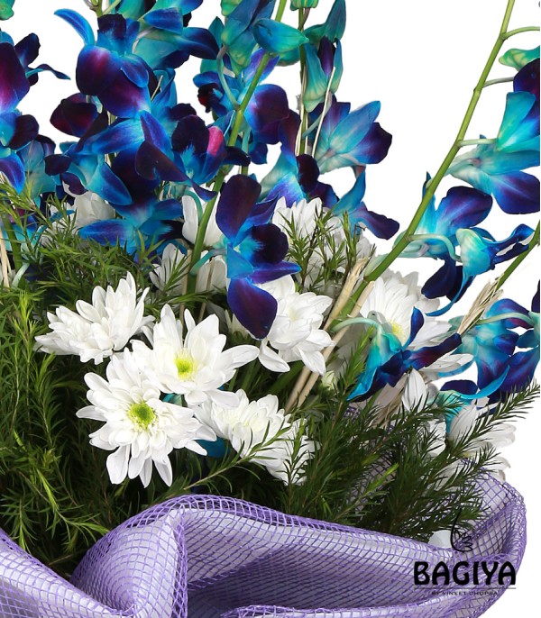 Bunch of 10 blue orchids with 10 white daisy tied with greens  wrapped beautifully with jute mesh and frosted paper.