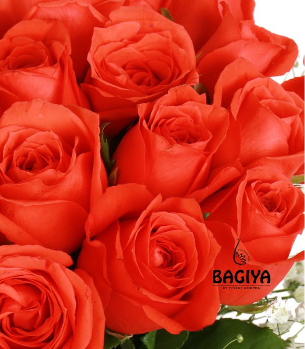 A stunning bouquet featuring a bunch of 20 vibrant orange roses, carefully hand-tied with delicate white gypsophila for a soft, elegant touch. The arrangement is beautifully wrapped in sheer organza fabric, adding a graceful finish. Perfect for expressing warmth, enthusiasm, and heartfelt emotions on any special occasion or celebration.