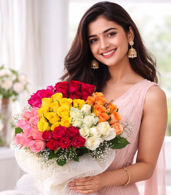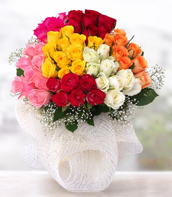 A Big Bunch of 50 Mixed Color Roses Wrapped in a Beautiful Packing.