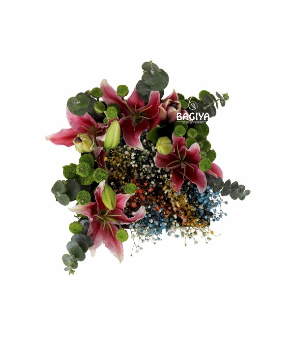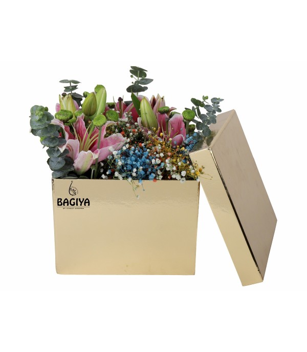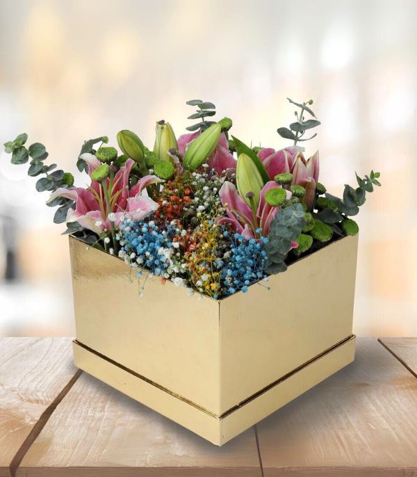 Box of Pink Lily, Chrysanthemums, Colourful Gypso