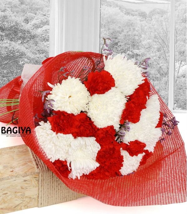 Bunch of 15 red carnations and 10 white chrysanthemums packed in a red sheet with fillers