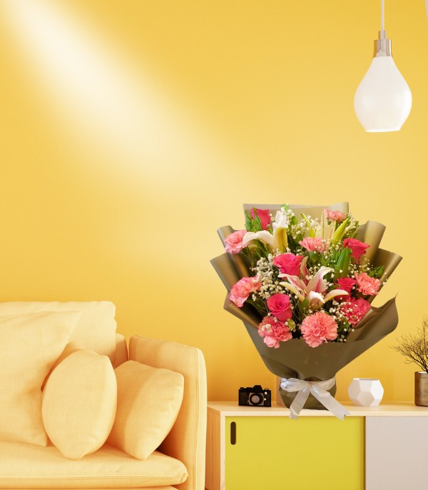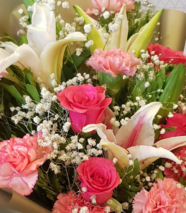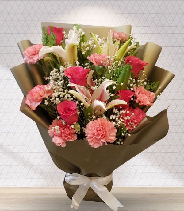 Elegant bouquet with pink roses, white lilies and carnations. Expertly arranged and wrapped in a sophisticated brown glossy paper, it presents a captivating gift suitable for expressing a range of heartfelt emotions. Bring a burst of beauty to any occasion with this exquisite floral arrangement.