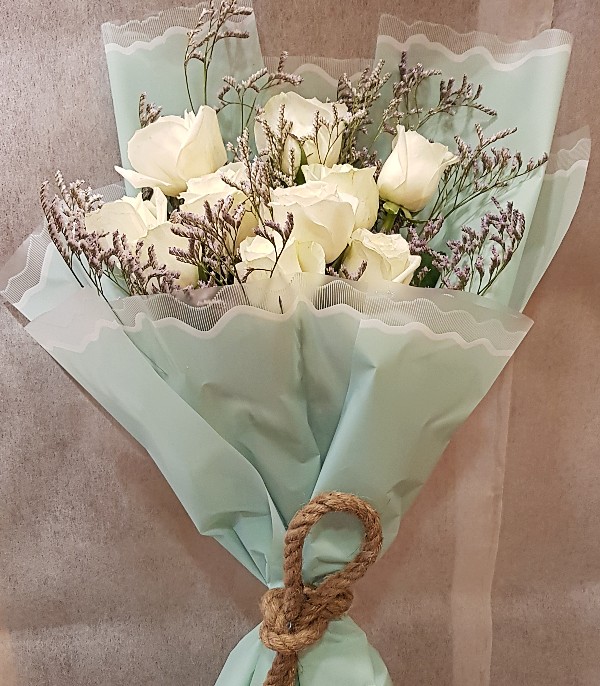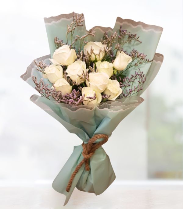 Beautiful bouquet of 10 white roses, accented with delicate purple flowers and wrapped in soft blue paper. Tied with a simple brown twine, giving it a rustic touch. It would make a perfect gift for any occasion.