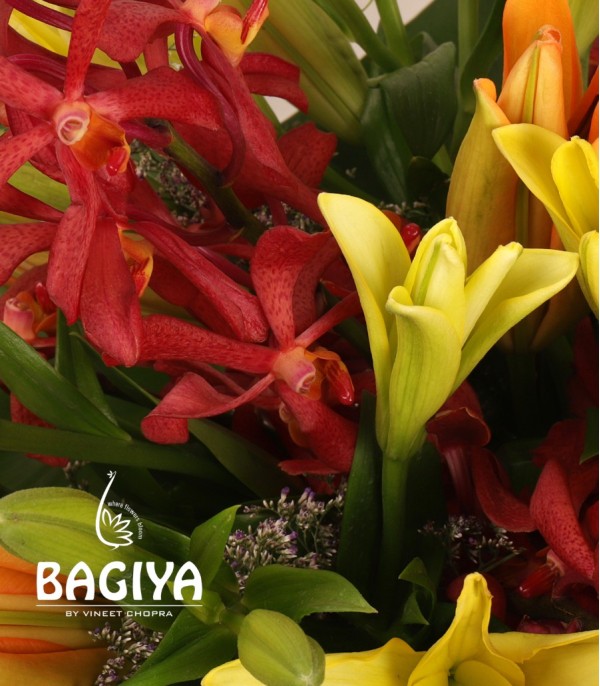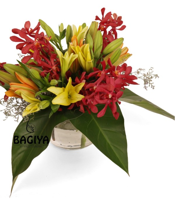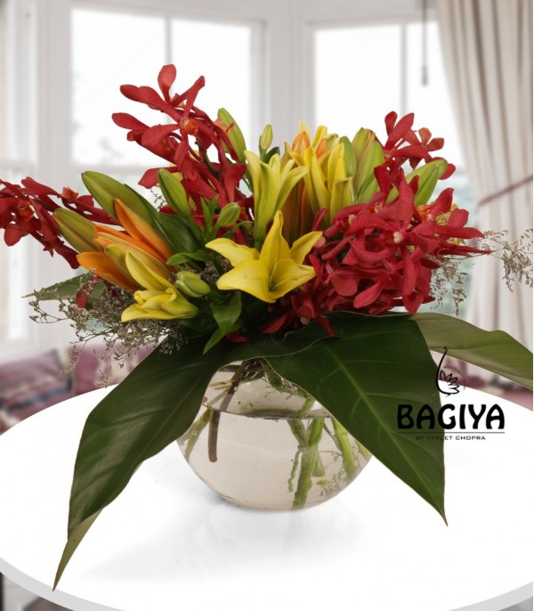 8 Mokaro Orchids and 6 Yellow Ascetic Lillies in a Fish Bowl With Green Foliage.