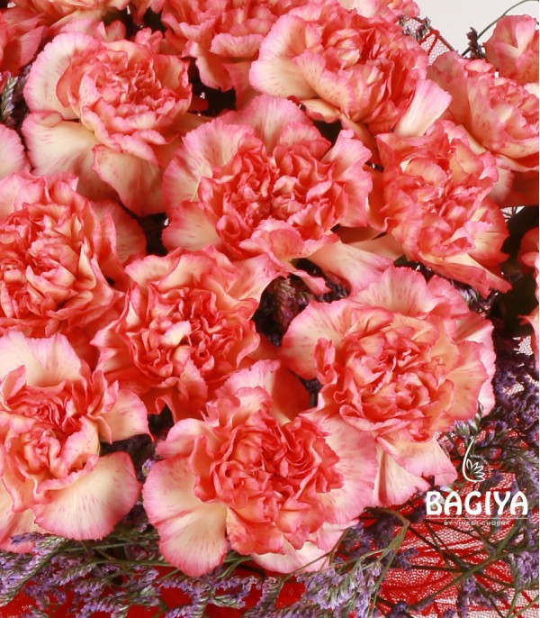 Bunch of 30 Orange carnations wrapped beautifully net with fillers.