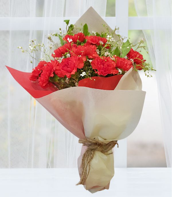 Vibrant bouquet featuring 10 bright Red Carnations accented with delicate white filler flowers and fresh greenery. Wrapped in contrasting red and beige paper and tied with twine, it has a cheerful and rustic charm.