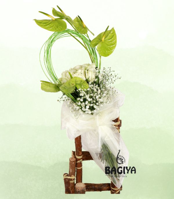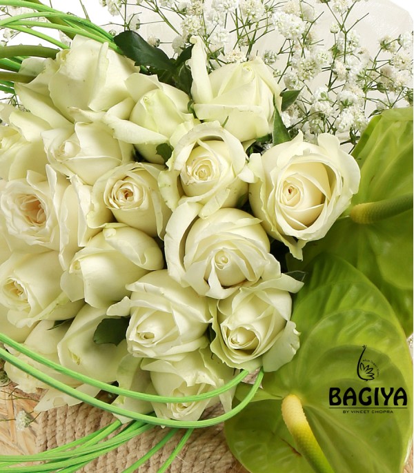 Bunch of 20 white roses and 6 green anthuriums tied with gypso and midelino sticks wrapped with organza.