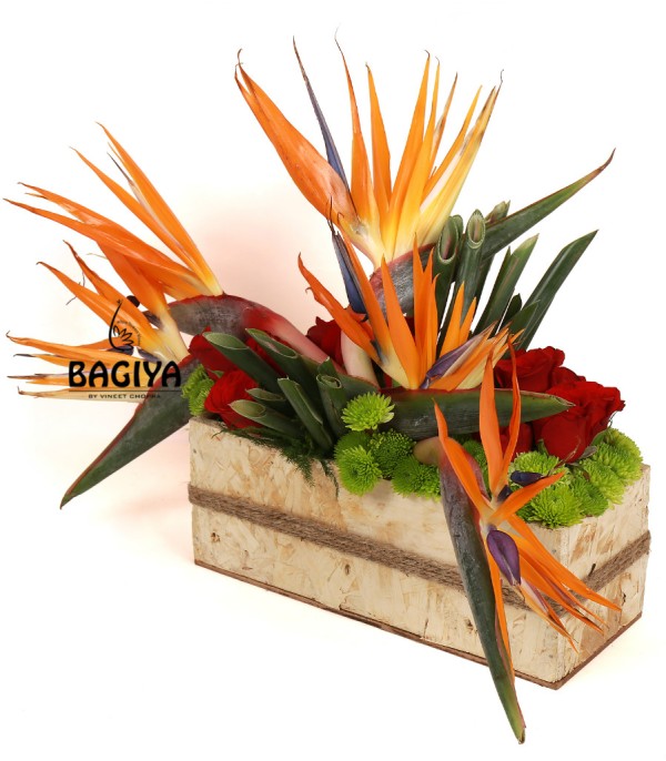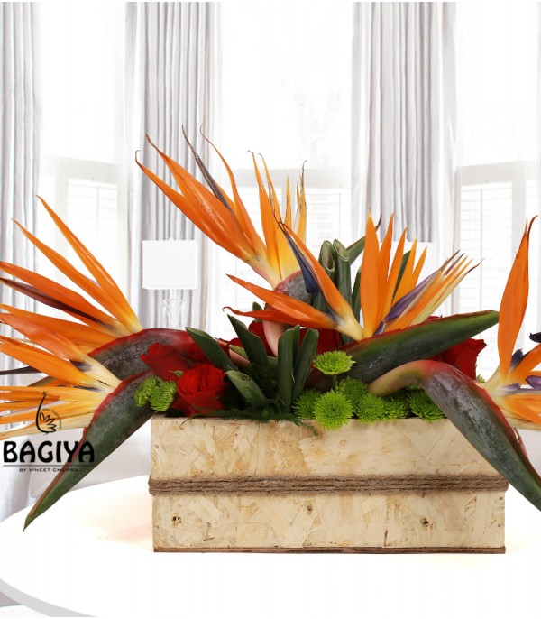 Designer arrangement of 5 bird of paradise along with 10 red roses arranged beautifully with 3 green chrysanthemum and green fillers