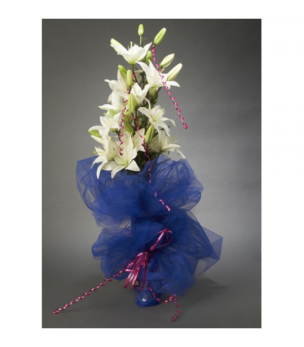 5 White Acetic Lily Attractively Packed in Blue Net With Blue Wire Ribbons.