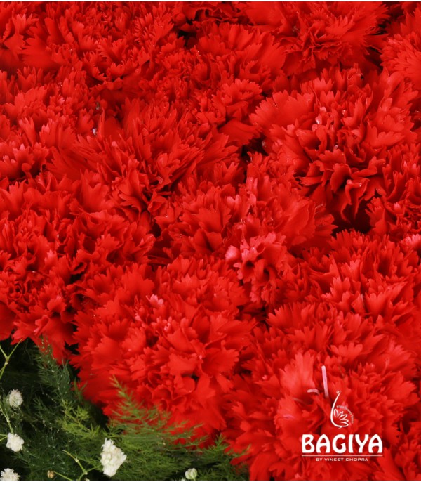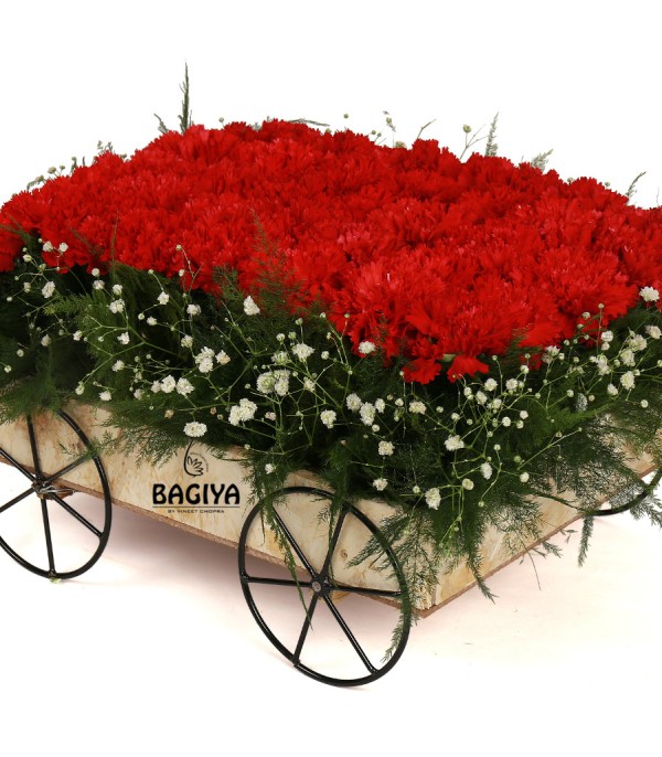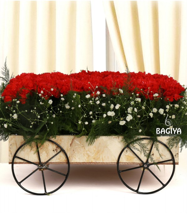 A wooden cart includes 28 red carnations with greens n gypso. Further the basket can be used as fruits basket on dining table.
