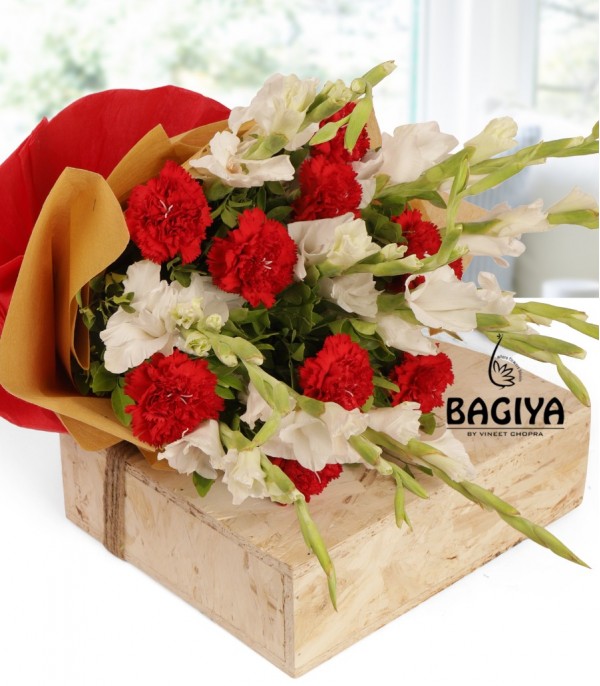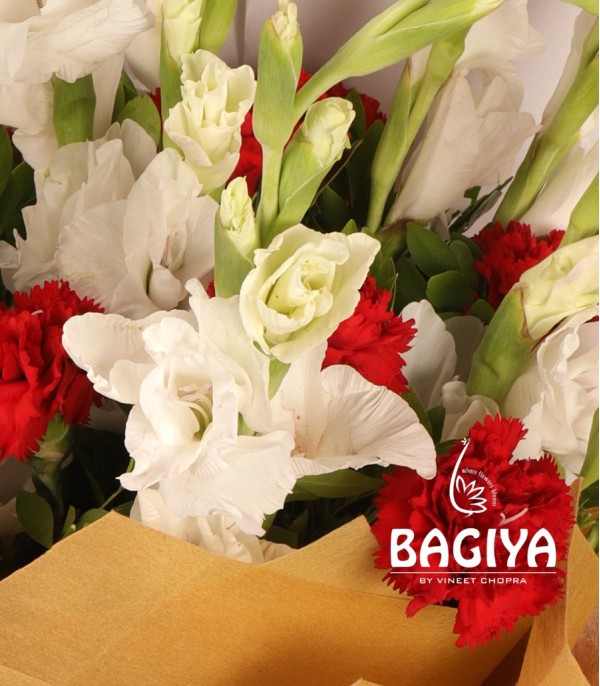 Bunch of 10 Red Carnations and 10 White Glades Wrapped in Twin Colour Non Voven Paper.