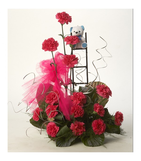 To Give Happiness, It Includes 15 Pink Carnations Arranged in Ladder Stand With 1 White Teddy and Pink Net.