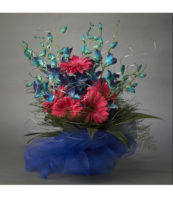Reach Out With Bright Blue Orchids and Pink Gerberas to Wish Your Loved One. Bunch Includes 5 Gerberas and 8 Stems of Orchids.