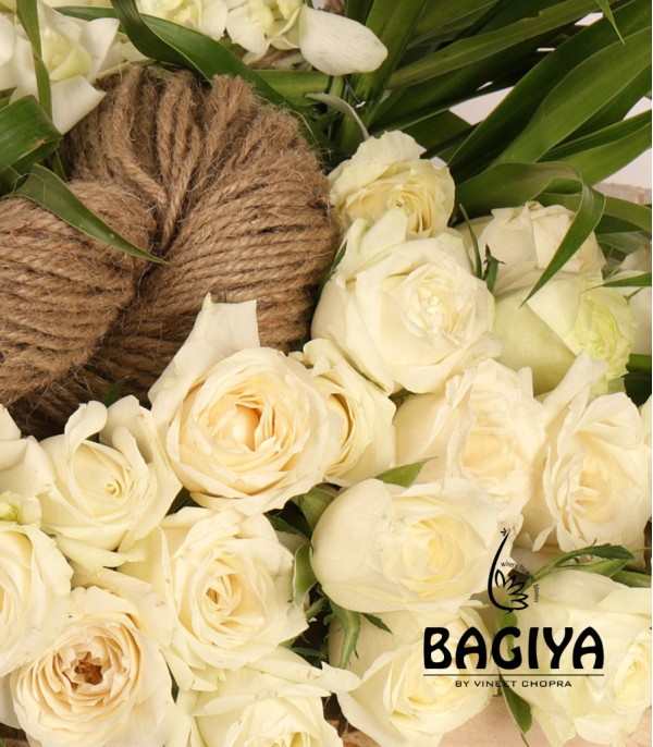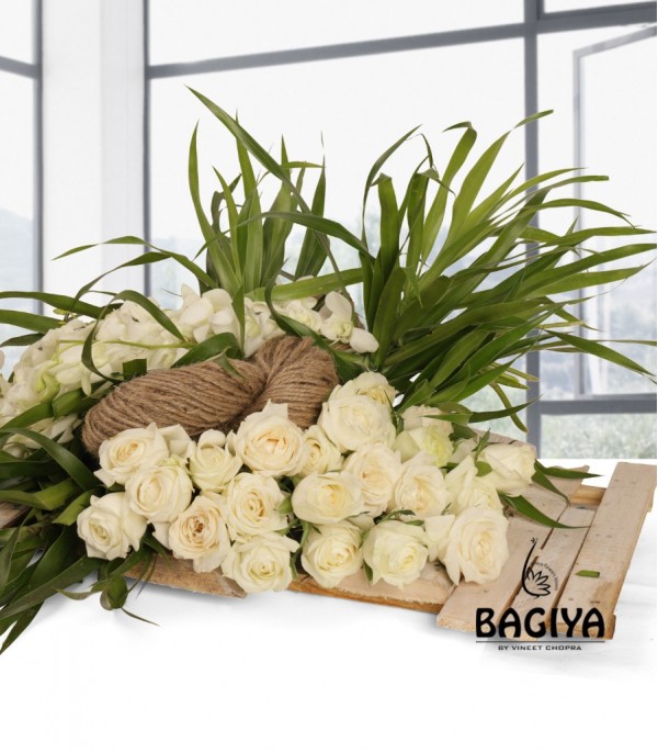A wooden tray includes 10 white orchids with 20 white roses and green fillers.