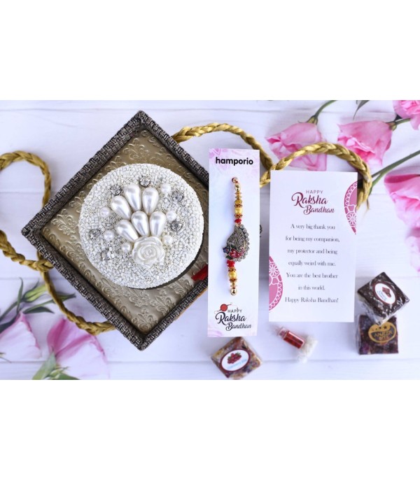 this wonderful Rakhi hamper. Featuring golden silk cloth, this gorgeously