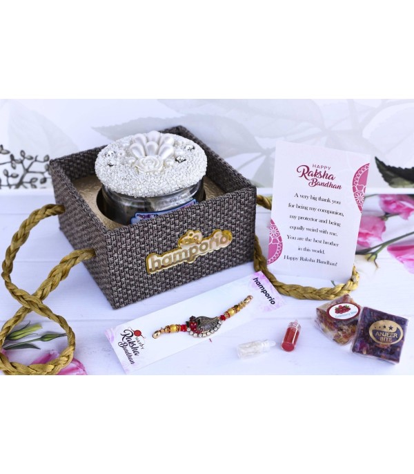 Hamper with a jar with beautiful lid+ roli-chawal + 1 rakhi wish note.