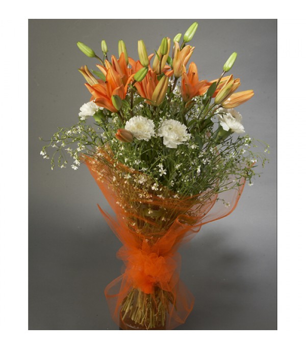 Bunch of 4 Orange Acetic Lillies With 10 White Carnations to Give Adorable Looks Wrapped in Orange Net