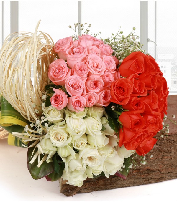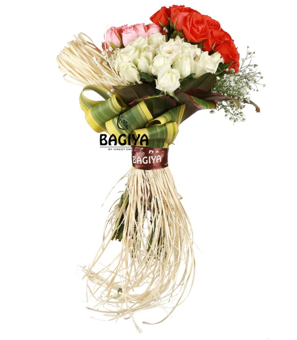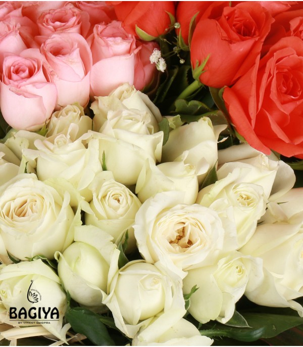 20 White Roses, 20 Pink Roses, 20 Orange Roses, Gypso Fillers with rafia and green leaves.
