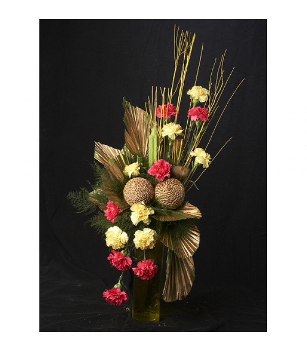 Flowers Clad in Glass Vase With 1 Candle N Some Dry Sticks...15 Pink and Yellow Carnations