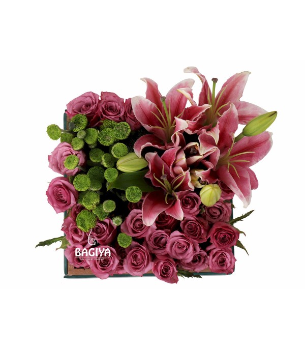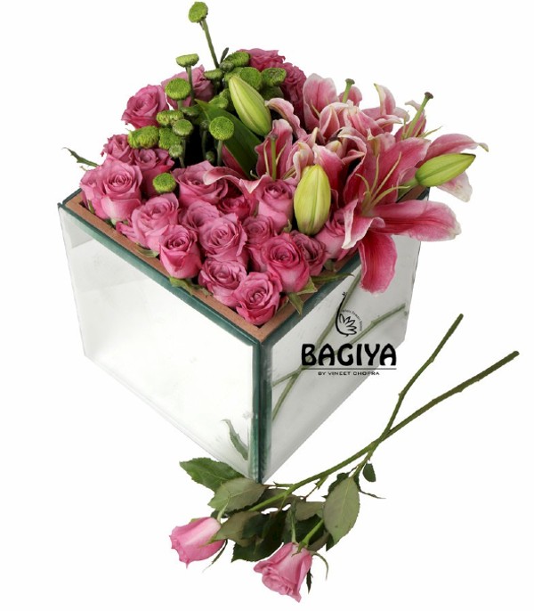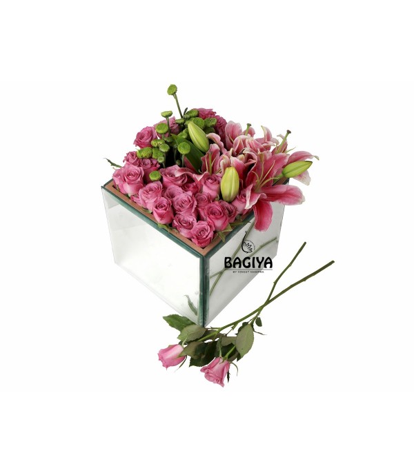 Mirror Box of Pink Roses, Lily, chrysanthemums